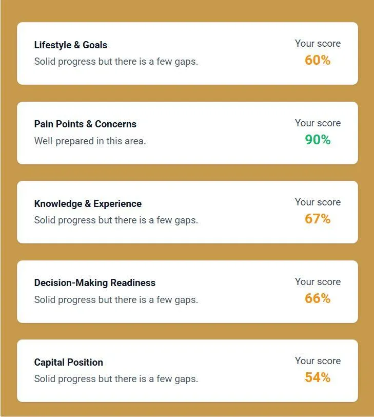 You’ll see exactly where you stand; Beginner, Emerging, or Ready-to-Invest.